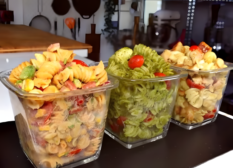 - Meng de pesto met gekookte pasta, cherrytomaten en mozzarella.