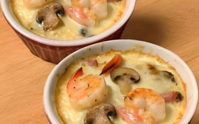 Zeevruchtenschotel: Sint-jakobsschelpen, champignons en garnalen