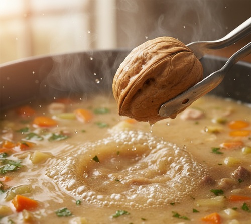 Het toevoegen van een hele walnoot (met schil en al) aan kokend water voor soep, bouillon of zelfs tijdens het koken van bepaalde pasta, kan een licht, houtachtig aroma vrijgeven. Deze geur voegt een subtiele diepte toe, die soms doet denken aan geroosterde hazelnoten. Onze voorouders gebruikten deze techniek om eenvoudige gerechten te verfijnen zonder dure kruiden toe te voegen.